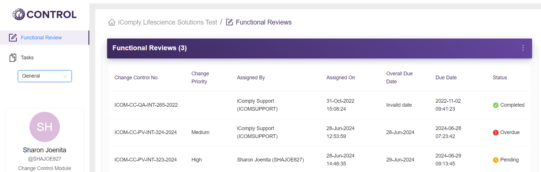 The Functional Reviews list displays functional review requests assigned to you by reviewers.&#x20;
